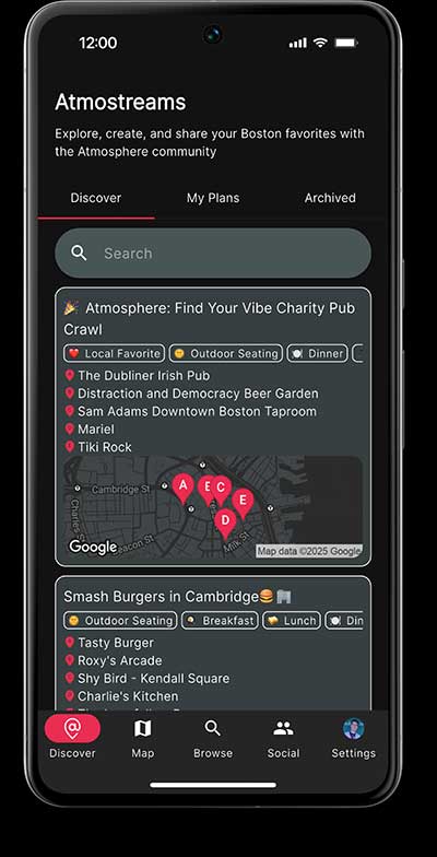 When Kurt Marcinkiewicz, Tim Sakharov, and Logan Wells graduated from Khoury College in the late 2010s and headed into the world of tech entrepreneurship, they carried a shared vision to build technology that not only connects people digitally but also enriches the ways they connect in real life. That vision has come to life with Atmosphere, an app designed to help Bostonians discover social spots that reflect their lifestyles and tastes.